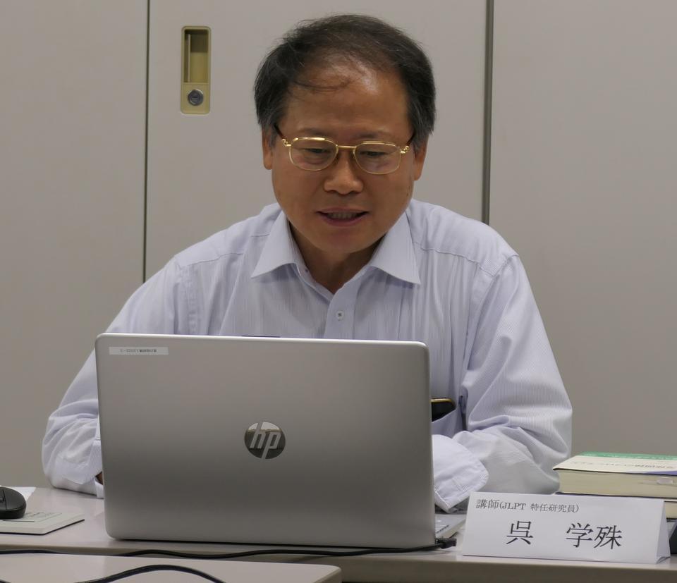 写真 冒頭挨拶する神津共同塾頭(上段左)講演する呉学殊氏(上段右)