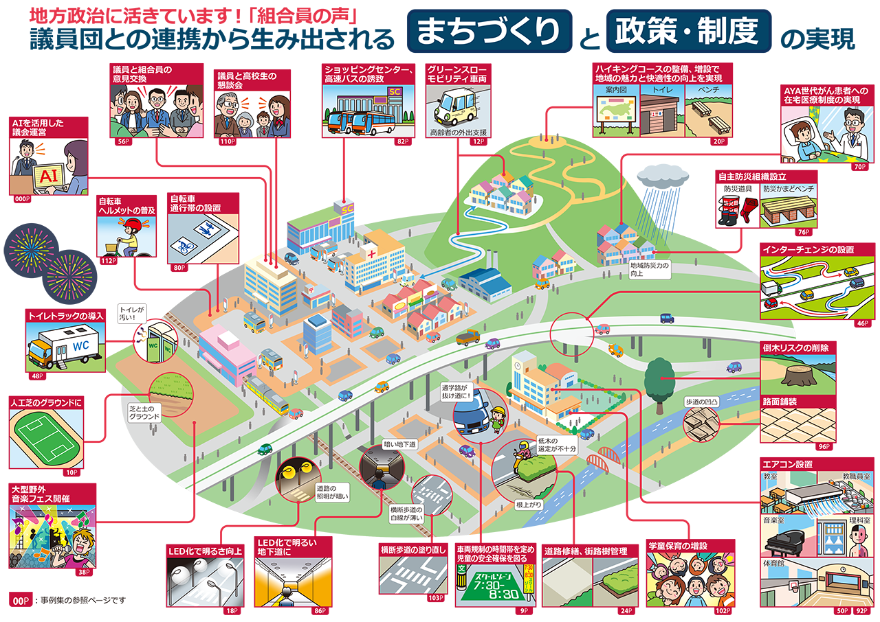 労働組合が地域コミュニティに関わるうえでは、政治を通じた課題解決も重要です。一昨年、電機連合の組織内議員や協力議員の取り組みをまとめた冊子をつくったところ、多岐にわたる活動が見えてきました。下図はその取り組みをマッピングしたものです。